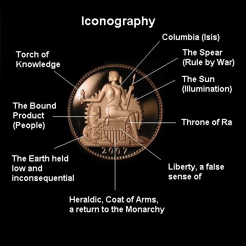The purposes of these icons and images may be of importance or they may just be the artist’s interpretation of what he or she was asked to produce. Regardless, Columbia or Isis from the Ancient Egyption appears to be sitting on the Throne of Ra, ruling through knowledge, war and fear, and considering the Earth and its people as a “side issue.” It’s interesting imagery, I hope someone professional takes a run at it (but only of course if these images represent the allegedly real coins). Iconography and Sigil Magic, two rather interesting topics, considering the embedded information coming out of all of the ad campaigns and corporate logo’s these days. You can’t turn on the TV or walk down the street without being assaulted by a message from some corporation.