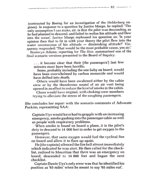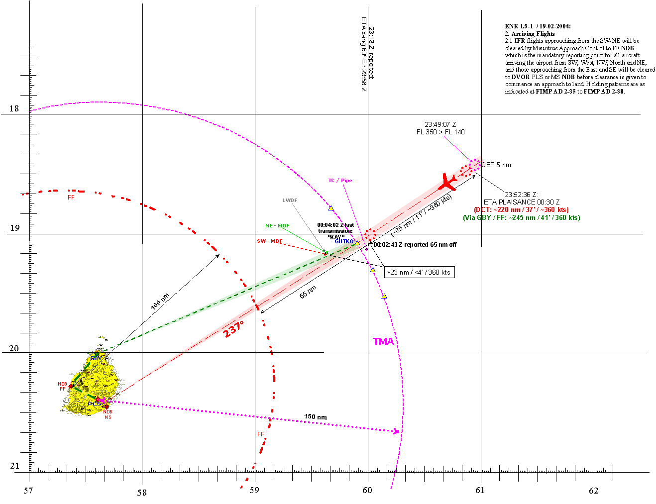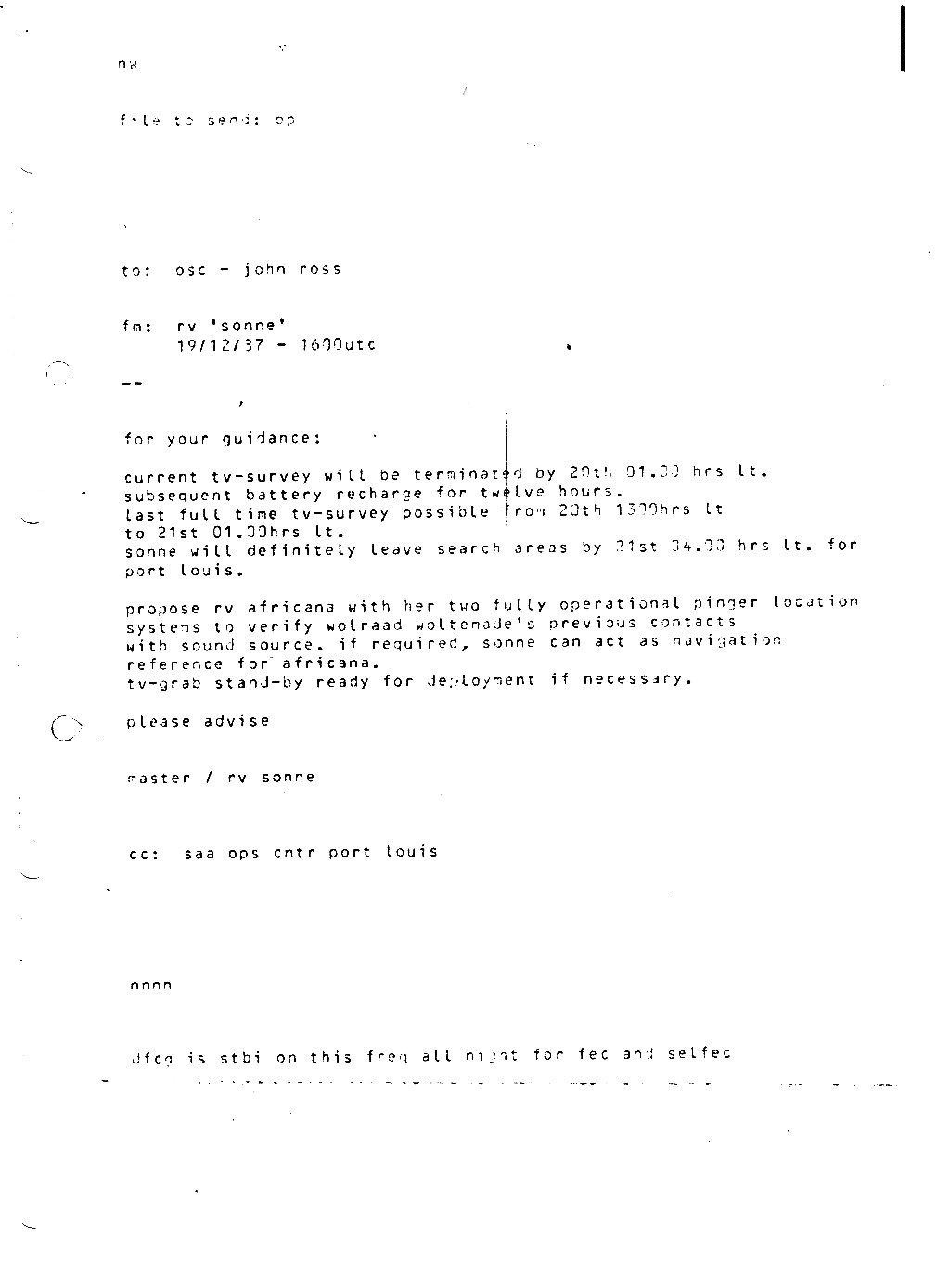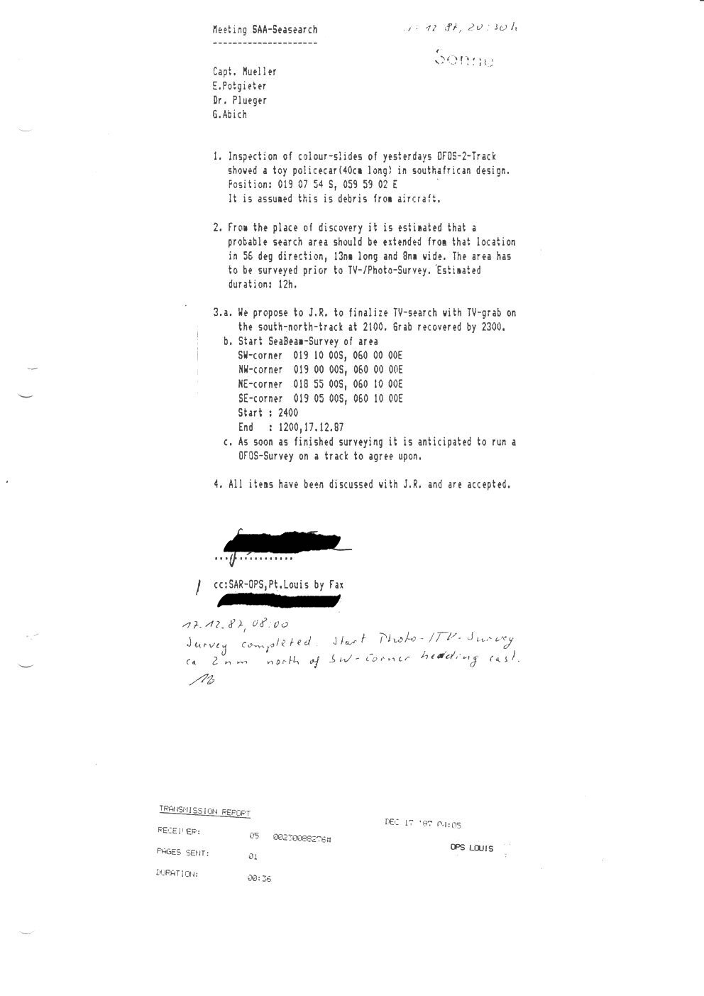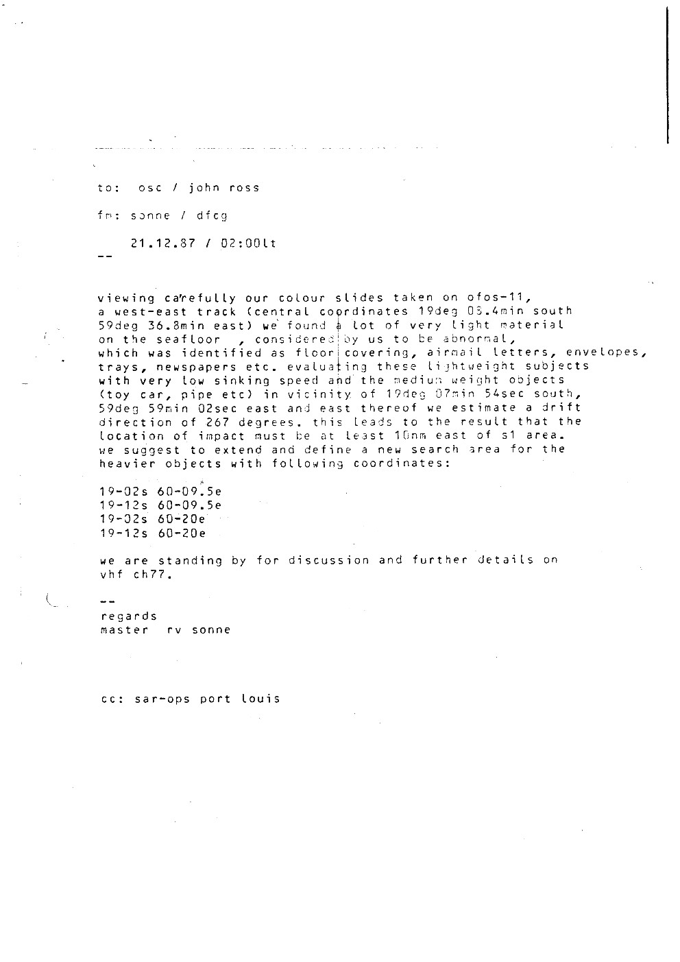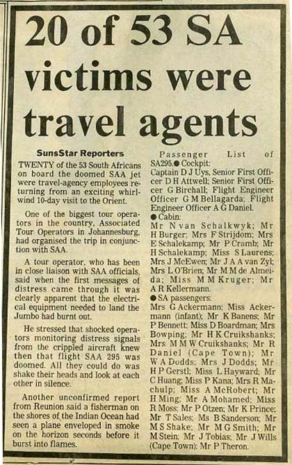 It has also been reported on other sites that SAAF planes were in the air at the time, it has been posed that there is a possibility of a ‘false beacon’ as was also suggested in another Cecil Margo case, the Samora Machel plane crash of 1986. If the trick worked once, I’d guess they might keep using it. I’ve been told that since the operation of the 747 is literally pushbutton once in the air and a beacon can be carried on a plane, in a small boat, etc. the possibility of a false beacon is good because there was no logical reason for the plane to turn north away from Mauritius, unless the change in direction was caused by starboard drag which is examined later.