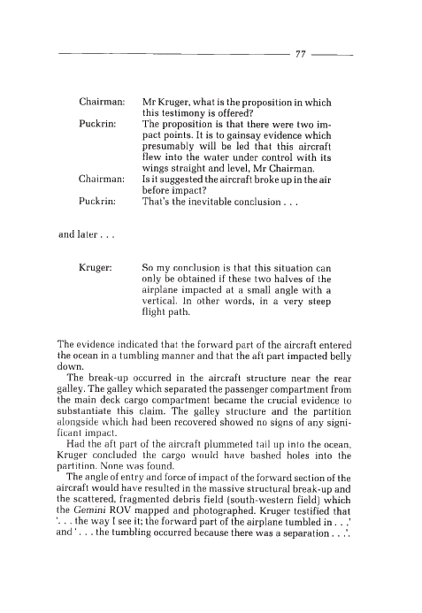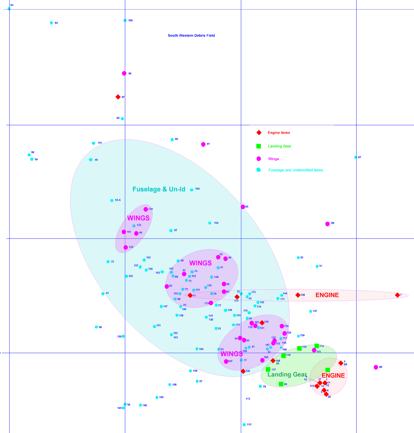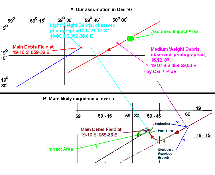 August 2006 - I have just received two opinions (remember these are unofficial opinions from a crash site investigator with the Canadian government); one - that it appears the plane turned almost NNW to N (perpendicular to the known flight path) in a 30 degree bank before it was destroyed. Second opinion, the debris field is consistent with a lateral explosion which would have possibly blown the wings off. This is not confirmed, we need pictures of the re-assembly at Jan Smuts.