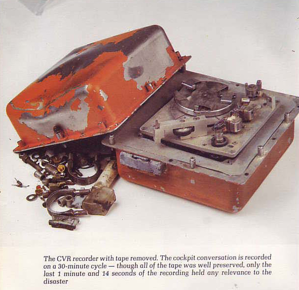 I’m going to go on a little side excursion here... Since it has been evidenced that the solder in CVR re-flowed on the CVR circuit boards. For that to occur the temperature inside the CVR had to reach the melting point of solder, or at least 190 degrees centigrade. But, in critical aircraft components that have to withstand fire, the solder used generally has a melting point of 250 C or higher. You’ll notice in the pics of the CVR interspersed here, that there is still paint on the outer casing as well as the inner casing. If it was 190 C inside the case, we can imagine that it would considerably higher outside the case and all paint should be gone. The second problem, if we look at cvr3.jpg, is this looks like a magnetic tape transport, wound similar to an 8 track. Magnetic tape has a melting temperature of between 100 and 120 degrees centigrade and a reconstitution temperature (or baking repair temperature) of about 60 degrees C.